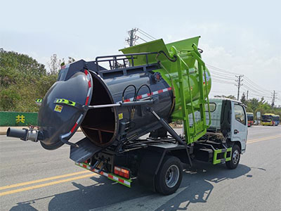 東風小多利卡餐廚垃圾車改裝容積4~5m3,罐體厚度4.75mm,配備掛桶提升機構,后蓋液壓開啟,罐體可以舉升自卸,尾部帶自流閥。