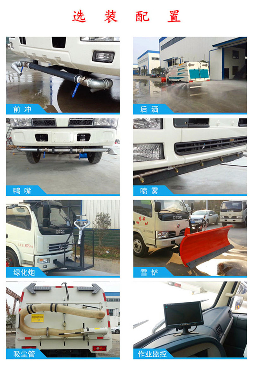 9. 東風8方洗掃車左右立掃為單掃盤,減少了掃刷的數量和掃刷消耗量,能降低使用成本。掃刷上加裝噴水裝置,用于噴霧降塵。左右立掃分開控制,可實現右掃和全掃等不同的作業模式。
