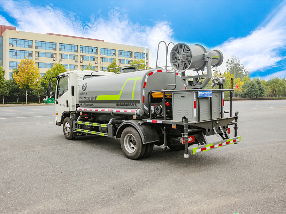福田 H2 藍牌 5 方抑塵車-灑水車產品產品配置 1.底盤配置: 福田 H2 駕駛室,發動機全柴 115 馬力,萬里揚 5 檔變速箱, 7.00R16 鋼絲胎,3360 軸距,中控鎖,電動玻璃,T-BOX(全國通用), 5T 后橋,斷氣剎,ABS2.上裝配置: 1、罐體約為 5 方,可加裝 30 型霧炮 2、邊燈帶電,罐體尾部上方標配 2 個紅色示寬燈, 3、標配前噴為鴨嘴直沖,標配后沖,用戶可根據自己的需求,來調 整對沖位置。 4、花紋防滑平臺,炮筒后蓋為定制型螺栓卡扣, 5、前噴、后沖、后灑、側噴,綠化高炮開關球閥均采用 50 大通經 不銹鋼球閥, 6、新式軸承式水炮,更加耐用, 7、40-50 型水泵, 8、防腐法蘭墊片, 9、鋁制后灑,不易炸開 10、罐體自動焊(美國林肯焊機及電源),拼板自動焊接,封頭環 縫焊接,無氣孔,焊縫美觀。 11、側護網、后保險杠、均為螺栓連接,方便拆卸,維修方便。 12、塑料擋泥板,替代鐵擋泥板,更加輕便,用螺栓連接,方便拆 卸。 13、前部、后部主管連接處為 6 孔圓法蘭,不易沖墊