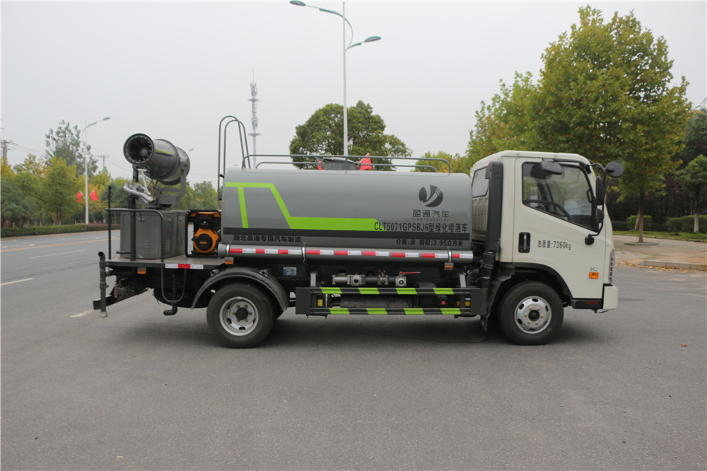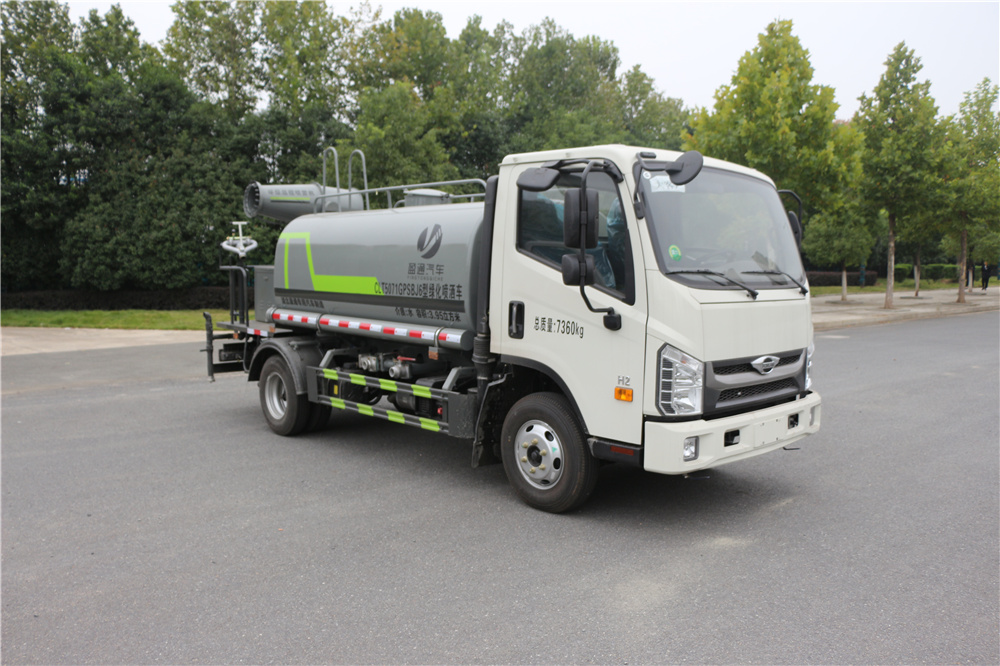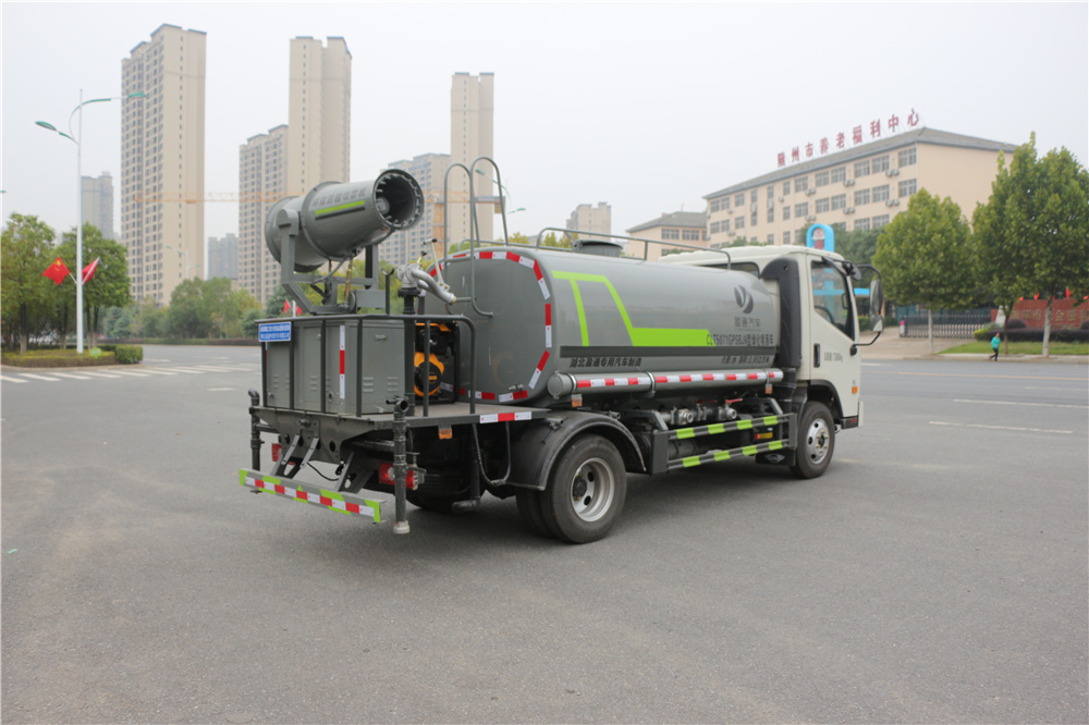 - 專用功能配置:罐體實際容積為5立方米,采用武鋼優質碳鋼板卷壓成型。配備專用灑水泵,自吸自排,前噴后灑、側噴、后工作平臺及灑水高壓炮。灑水泵自吸高度為6米左右,整車灑水寬度14米左右,后工作平臺水炮可調成:直沖狀、大雨、中雨、小雨、毛毛雨,有效射程≥28米,整車帶接頭、水位計,自流閥及自吸功能。后工作平臺主管道帶1寸澆花接口,附送2根3米水管,1個爬梯,兩側及后保險杠。 - 備注:尾部后工作平臺可以選裝30型(40型)型柴油機組霧炮機,平行順風的狀態下,霧化射程20-30米。