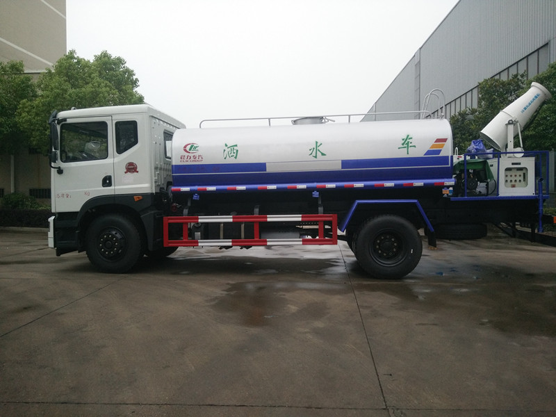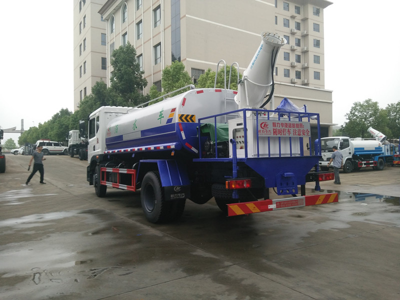灑水車配置前沖、后灑、左右側噴水、帶后工作平臺、平臺上安裝綠化灑水高炮(炮噴射形狀可調節:直沖、大雨、中雨毛毛雨、霧狀、可連續調節,360°旋轉),配消防接口,自流閥,濾網,帶專用灑水泵具有自吸自排功能灑水寬度≧14-16米,射程25-30米,帶增壓,方向助力。罐體采用優質碳鋼制作。帶兩根輸水軟管