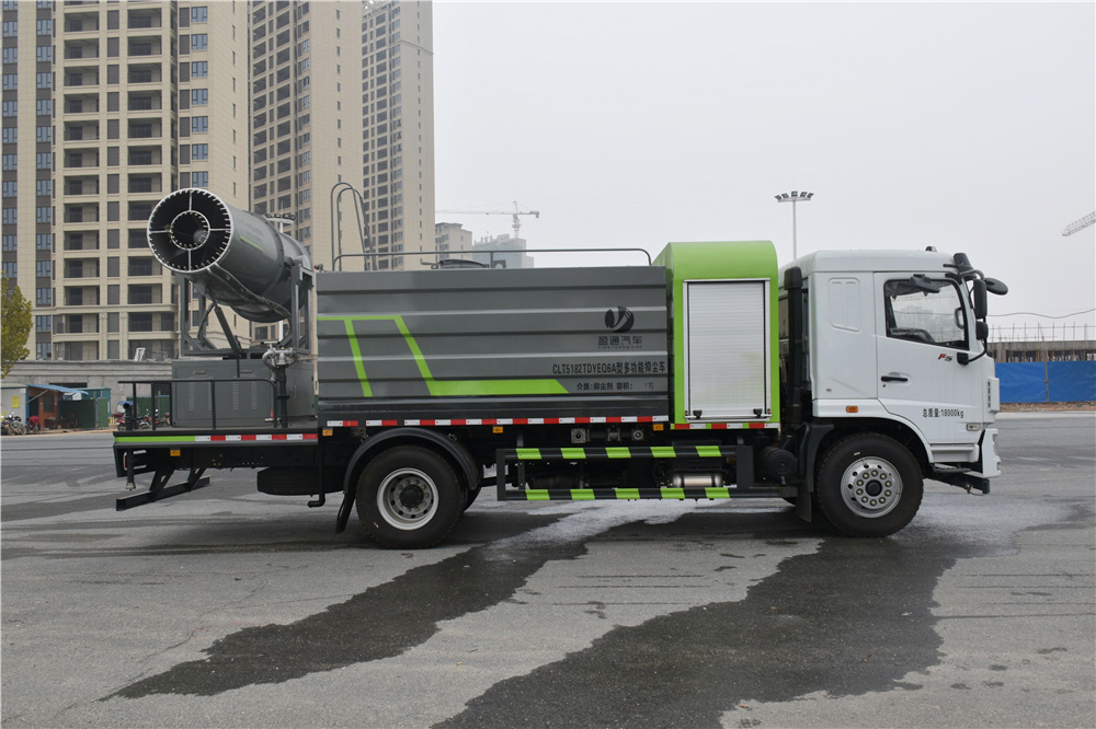 - 多功能抑塵車 產品主要技術資料 - 產品名稱: - 多功能抑塵車 - 外型尺寸(mm): - 8850,8650,8810×2500,2550×3800,3900 - 底盤型號: - EQ1180GL6DJ - 貨廂尺寸(mm): - 3400×2450×1580 - 總 質 量 :(kg) - 18000 - 接近/離去角(° ) - 25/13,28/13 - 額定質量:(kg) - 7550,7485,8150,8085,9050,8985 - 前懸/后懸(mm): - 1450/2900,1250/2900,1410/2900 - 整備質量:(kg) - 10320,9720,8820(Kg) - 高車速(km/h): - 88 - 排放標準: - 國六 - 底盤參數 - 底盤型號: - EQ1180GL6DJ - 軸荷: - 6500/11500 - 軸 數: - 2 - 燃油種類: - 柴油 - 軸 距(mm): - 4500 - 前 輪 距(mm): - 1875,1910,1950,1965,1970,2020,2050 - 駕駛室乘人數: - 2,3 - 后 輪 距(mm): - 1820,1870 - 輪 胎 數: - 6 - 彈簧片數: - 9/11+8,3/4+3,9/10+8 - 輪胎規格: - 10.00R20 18PR,295/80R22.5 16PR,275/80R22.5 18PR - 整車說明: - 該車用途為抑塵降霾.主要裝置為罐體及噴霧裝置;隨底盤選裝駕駛室;罐體有效容積:10.5立方米,罐體外形尺寸(長×長軸×短軸)(mm):3400×2450×1580,ABS型號及生產廠家為:3631010-C2000/東科克諾爾商用車制動系統(十堰)有限公司,J ABS/焦作博瑞克控制技術有限公司;側、后防護材料均為:Q235碳鋼,連接方式均為:螺栓連接,后部防護截面尺寸(mm):120×50,后部防護離地高度(mm):450.選裝罐體左右樣式,選裝噴霧裝置樣式。 - 發動機參數 - 發動機型號 - 發動機生產企業 - 排量(ml) - 功率(kw) - YCS06200-60 - 廣西玉柴機器股份有限公司 - 6234 - 147/199 - 灑水車底盤配置:東風汽車集團有限公司國六系列底盤。整車配備:廣西玉柴機器股份有限公司四缸玉柴200馬力發動機,發動機型號YCS04200- 68, 法士特8檔變速箱,10.00R20輪胎。