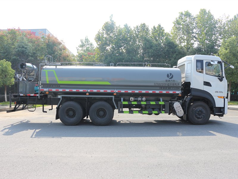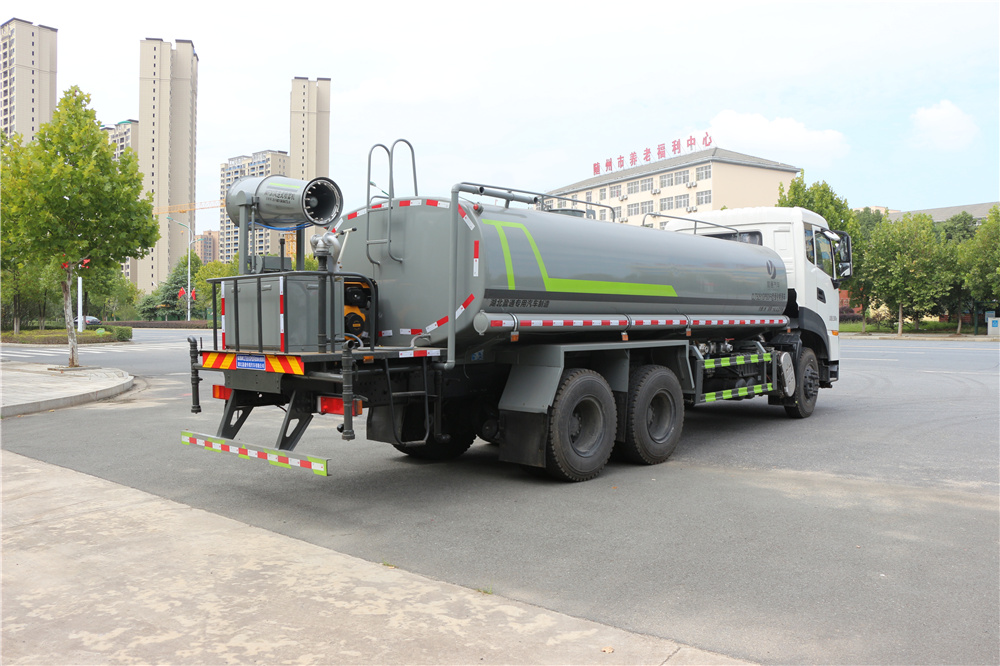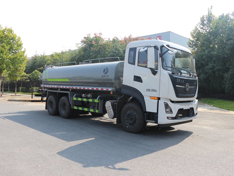 2 東風商用車有限公司 6缸350馬力發(fā)動機,發(fā)動機型號DDi75E350-60, 7檔變速箱, 11.00R20鋼絲胎。- 空調(diào)、電動玻璃、中控鎖、氣囊座椅、行車記錄儀、 轉向器及離合器液壓助力,氣壓制動,排氣制動。 - 專用功能配置:罐體容積約為23立方米,公告有效參數(shù)18.6立方米、采用武鋼優(yōu)質(zhì)碳鋼板卷壓成型。配備專用灑水泵,自吸自排,前噴后灑、側噴、后工作平臺及灑水高壓炮。灑水泵自吸高度為6米左右,整車灑水寬度14米左右,后工作平臺水炮上下左右360度旋轉可調(diào)成:直沖狀、大雨、中雨、小雨、霧狀,有效射程≥28米,整車帶接頭、水位計,自流閥。后工作平臺主管路帶1寸澆花接口,附送2根3米水管,1個爬梯,兩側及后保險杠。 - 選裝配置: - 1、可選裝4個或6個氣動球閥開關駕駛室內(nèi)操作; - 2、可選裝前置電子灑水炮駕駛室一鍵操作。 - 3、后平臺可加裝30米 、40米全自動柴油霧炮機組;可噴灑農(nóng)藥,防役消毒,工地噴霧,拆遷降塵多功能使用。 - 4、可另加箭頭燈一對!