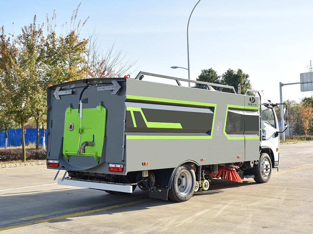 1. 東風(fēng)多利卡洗掃車(chē)采用洗,掃,吸,混合的方式收集垃圾,濕式除塵、電液 PLC 一鍵控制,液壓傾翻卸料的作業(yè)方式對(duì)路面進(jìn)行清掃作業(yè)。