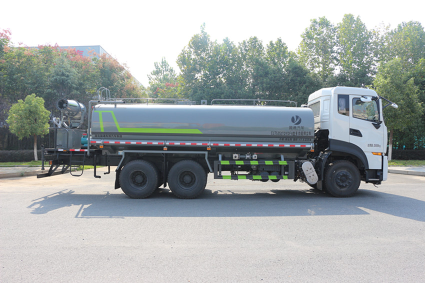 灑水車上裝配置:罐體采用5mm厚武鋼集團(tuán)供應(yīng)的罐車專用板材制作,容積:20立方;罐內(nèi)3道防浪隔板具有防波作用,減低罐內(nèi)液體的沖擊。配備國(guó)內(nèi)大功率灑水車專用水泵,可自吸自排,引水時(shí)間<15min,流量60m3/h,揚(yáng)程90米。東風(fēng)天龍灑水車其它專用部分標(biāo)配為:前沖、后灑、側(cè)噴、后工作平臺(tái)、360度可調(diào)節(jié)綠化水炮,水泵垂直吸程≧7米,前沖灑水寬度≧16米,綠化水炮射程≧35米,自流閥、濾網(wǎng)、消防接口(可連接消防栓取水,可作應(yīng)急消防用)。罐前量管(觀察罐內(nèi)水位)、罐后爬梯、罐上罐口帶簡(jiǎn)易護(hù)欄、罐側(cè)雙炮筒、6米長(zhǎng)4寸鋼絲塑膠管兩根,罐體表面雙層油漆工藝,防銹、耐腐蝕,其余有廠家標(biāo)配。可選擇加裝加裝藥盤、氣動(dòng)控制閥、噴藥設(shè)備、罐內(nèi)防腐等。