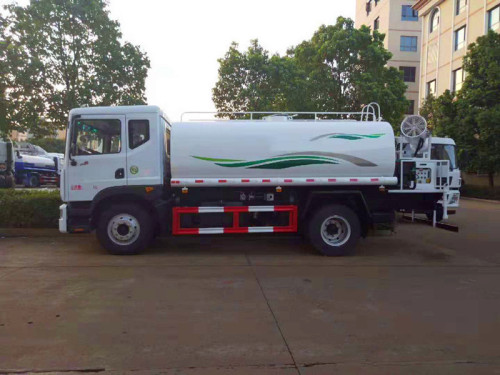 罐體采用4mm厚碳鋼板制作,罐體容積10噸,配備大功率專用灑水泵。前沖(噴)后灑,帶側噴,后置工作平臺,平臺上安裝綠化灑水高壓炮(炮噴射形狀可調成直沖狀、大雨、中雨、毛毛雨、炮可360度旋轉,射程≧25米)。帶自流閥,消防接口。帶自吸泵,可抽水或從消防栓上連接注水。