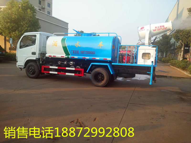 國六東風(fēng)小多利卡帶霧炮5方灑水車采用 大功率水泵,灑水車前沖(噴)后灑,帶側(cè)噴,帶65消防接口,后平臺(tái)帶泡不帶門,前封頭帶水位計(jì),后平臺(tái)主管路帶1寸澆花接口,后爬梯,配3米長抽水鋼絲塑料管兩根,用于抽水作業(yè)使用;罐后帶工作平臺(tái),平臺(tái)上帶安全護(hù)欄,裝高位綠化灑水炮一個(gè),灑水炮可全方位360度旋轉(zhuǎn),可連續(xù)調(diào)成直沖狀、大雨、小雨、毛毛雨等不同噴灑方式,調(diào)成直沖狀射程長度≥28m、高度≥12m,調(diào)成細(xì)雨?duì)钌涑虒挾取?5m;后工作平臺(tái)下用槽鋼連接焊有5mm厚保險(xiǎn)杠,提高灑水車的主動(dòng)安全性,泵可自吸自排,安裝過濾網(wǎng),帶消防接口,可通過消防栓進(jìn)水,帶自流閥,隨車選裝20米綠化卷盤,可噴灑農(nóng)藥