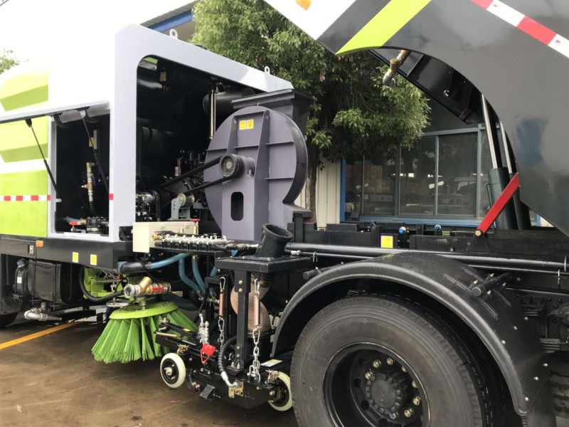 果。根據路面清潔程度,合理地選擇副發動機轉速、掃盤轉速及行走速度,使清掃效果達到 最佳。 f.工作中,注意防止掃盤與路面上的凸物撞出;倒車時,應收起掃盤和吸嘴;路面上有較大 的障礙物或尺寸大于 180mm 的垃圾物,應人工清除。 g.夏季工作,若液壓油箱的油溫超出 70℃,并有上升趨勢時,應立即停機,排除故障后,方 可開機工作。 h.主副發動機其水溫超過 105℃時應立即停機。 5.4.3  垃圾傾倒 掃路車到達垃圾場后,傾倒垃圾應注意: a.垃圾場應比較平整、不平度應小于 2o。 b.操作旋鈕實現垃圾箱先開門,后傾翻。 c.清除后門密封條上沾附的雜物和垃圾。 d.關閉后門、垃圾箱回位、副發動機熄火,駕駛掃路車前往車輛清洗場。 5.4.4  掃路車的清洗 掃路車到達清掃場后,主發動機熄火。 a.先沖洗整車外表; b.啟動副發動機,打開垃圾箱后門,頂升垃圾箱,支好安全撐桿,副發動機熄火; c.沖洗垃圾箱內部,特別注意清洗垃圾箱內過濾網; d.沖洗后門密封條,使其干凈; e.注意清洗時,嚴禁將冷水噴灑在剛熄火的發動機上;沖洗副發動機散熱片時,切勿用高壓 水近距離沖洗。然后放下安全撐桿,啟動副發動機,待垃圾箱回位后熄火,前往清掃車停放 場。 5.4.5  掃路車收車后的日常保養 到達停放場后,機手頂升垃圾箱,并支撐好安全撐桿,副發動機熄火。 a.用壓縮空氣清除空氣濾芯中的灰塵; b.用柔軟的布擦除液壓閥組上的灰塵; c.檢查風機軸承部位的潤滑,每六天加注一次潤滑油,待清潔水干燥后,放下撐桿,垃圾箱 回位(后門不要關緊,留有空隙,使密封條處于放松狀態),熄火,此時掃路車處于停放狀 態。