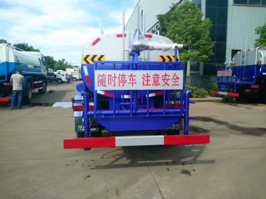 灑水車前裝有鴨形噴嘴或圓頭沖嘴,后面裝有圓柱開灑水噴嘴或蓮蓬頭噴嘴,后部有一工作平臺,裝配有水炮。帶消防接頭,帶自流閥,帶自吸功能,選配20米綠化消防卷盤。