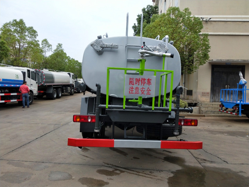 功能說明:灑水車前裝有鴨形噴嘴或圓頭沖嘴,后面裝有圓柱開灑水噴嘴或蓮蓬頭噴嘴,后部有一工作平臺,裝配有水炮。后部還可裝8個噴嘴(選裝)噴水器一般用于沖洗街道。帶消防接頭,帶自流閥,帶自吸功能,選配20米綠化消防卷盤。