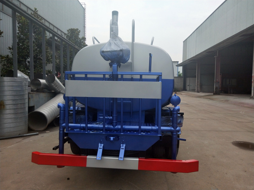 該灑水車具有前沖后灑、側噴(更換噴頭后變為側花灑)、后置式工作平臺(帶踏梯,四周有安全護欄)、平臺上設置有高壓水炮(可360°旋轉,可調成柱狀射程28米,也可調成霧狀射程14米,可調成:直沖狀、大雨、中雨、小雨、毛毛雨),整車灑水寬度大于14米.配備優質大功率專用灑水泵,取力器,雜物過濾網,國標通用65型消防接口(可通過消防栓加水)、1套自流球閥系統(可自吸自排,吸程6米),2根引水鋼絲膠管(帶陰陽快速接頭),配鎖,水位計,作業高音喇叭.兩側及后加強型保險杠,防滑爬梯,膠管儲存筒.