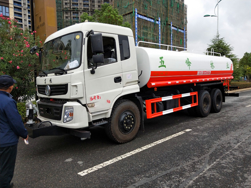 東風18噸綠化灑水車底盤配置:東風御龍18噸綠化噴灑車采用東風御龍專用底盤改裝而成,白色排半可前翻駕駛室,康明斯210馬力國五發動機,陜齒小八檔變速箱,4350+1300m雙橋軸距,10噸后橋,10.00R20原廠鋼絲胎,原廠ABS,帶方向助力,離合助力器,氣剎制動。