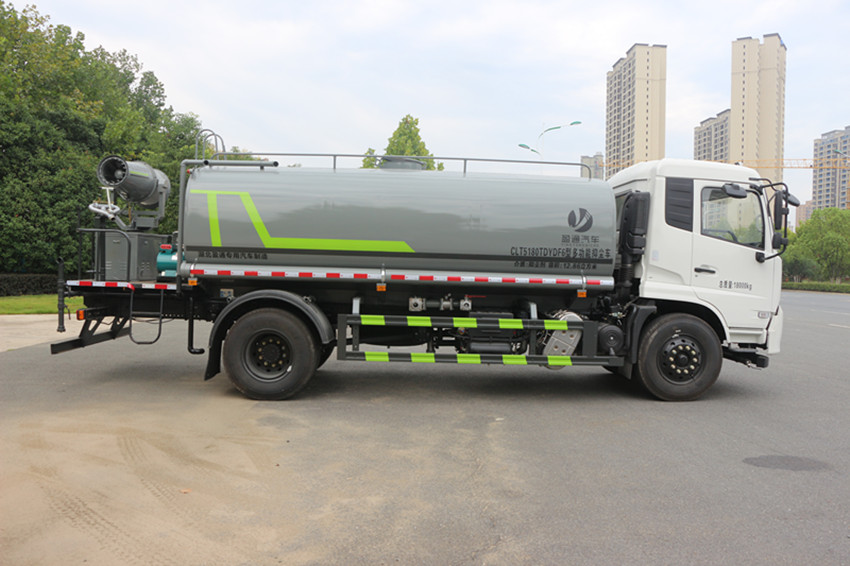 程力灑水車前裝有鴨形噴嘴或圓頭沖嘴,后面裝有圓柱開灑水噴嘴或蓮蓬頭噴嘴,后部有一工作平臺,裝配有水炮。后部還可裝8個噴嘴(選裝)。噴水器一般用于沖洗街道,起除塵和降溫作用,其噴水器可以用調(diào)節(jié)噴嘴螺紋的方法改變噴水器的噴灑方向和角度,高射水炮可以用于城鄉(xiāng)園林綠化及應(yīng)急消防。蓮蓬嘴可以澆落路中間噴水器沖起的灰塵,起到清潔空氣的作用。