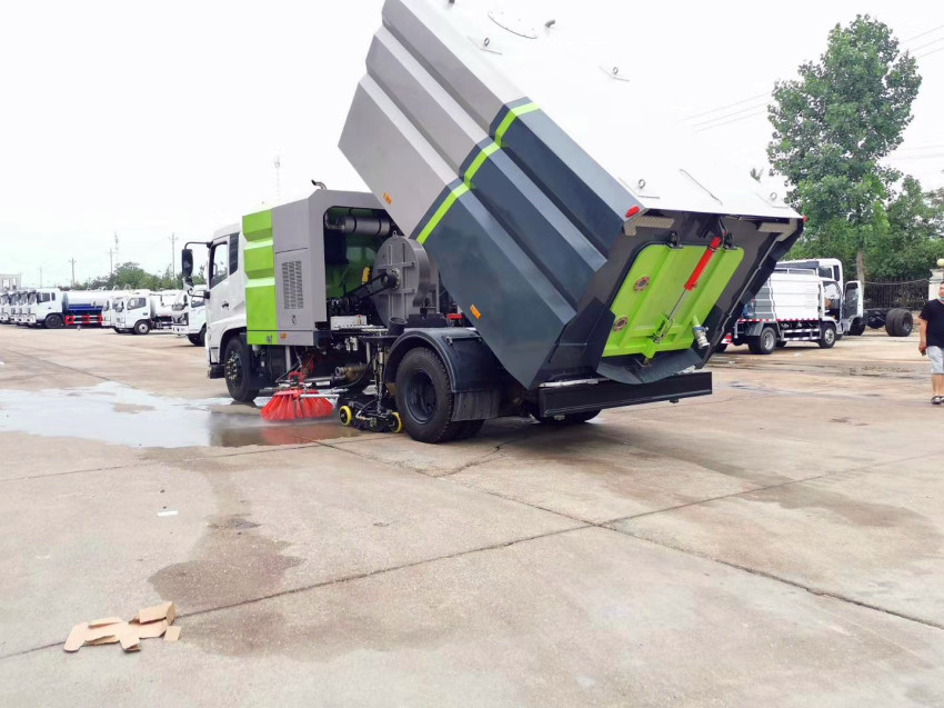 上裝配置:前置兩掃盤帶防塵罩,中置吸盤雙吸口、雙風道可進行晴雨天切換,康明斯170馬力副發動機,施耐德控制開關、海普瑞斯(或臺灣)電磁閥組、無極變速自動離合器、免維護離心式風機、手動泵應急系統。高精度垃圾箱過濾桶,進口脈沖閥自動清灰裝置,駕駛室內PLC一鍵控制,尾部LED箭頭燈