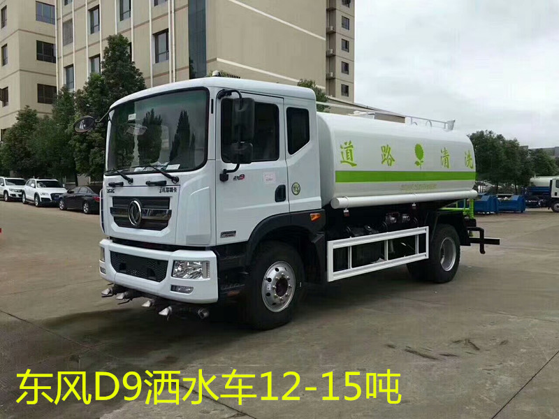 東風D9灑水車(12噸)罐體用4MM碳鋼板制作,罐內隔板具有防波作用,整車帶一個專用灑水泵(垂直最大吸程6米),灑水寬度14米,射程28,配備2個前沖、2個后灑、2個側噴、帶1個后工作平臺,平臺上安裝1個綠化灑水高炮(灑水炮可全方位旋轉,可連續調成直沖狀、大雨、小雨、毛毛雨,霧狀可調節沖洗高大樹木),引水時間<5min,流量90m3/h。帶1個消防接頭,帶1個自流閥,1個過濾裝置、人性化爬梯及側防護欄,安裝灑水音樂喇叭。